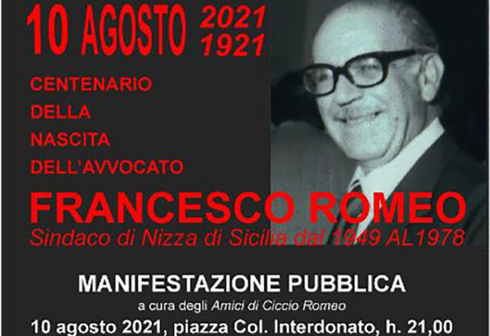 Nizza di Sicilia – Martedì 10 agosto ricorre il centenario della nascita dell’avvocato Francesco Romeo, sindaco di Nizza di Sicilia dal 1949 al 1978. Politico di grande respiro culturale del Partito Comunista Italiano, è stato alla guida del paese per 30 anni, contribuendo in maniera decisiva a plasmarne la fisionomia. Nizza di Sicilia lo ricorderà, nel giorno del centenario, dedicandogli un consiglio comunale e una manifestazione pubblica. Poste Italiane per l’occasione ha stampato un francobollo in suo ricordo che sarà annullato. Sarà possibile acquistarlo dalle ore 17.00 alle 22.00 nel gazebo allestito in piazza Colonnello Interdonato. Alla manifestazione parteciperanno sindaci, amministratoti comunale, politici e parlamentari. Aprirà i lavori il sindaco di Nizza Piero Briguglio e concluderanno Domenico Siracusano segretario provinciale Articolo Uno, Maria Flavia Timbro parlamentare nazionale e il segretario provinciale del Pd Nino Bartolotta. Moderatore avv. Tino Bellomo di Roccalumera.