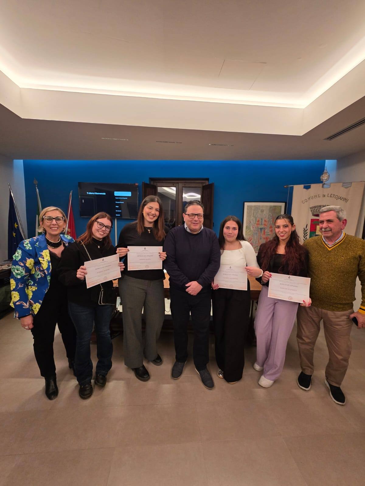 Letojanni – Quattro belle e brave ragazze che hanno investito nello studio e nella preparazione il loro futuro, sono state premiate dall’amministrazione comunale per il prestigioso traguardo raggiunto a coronamento degli studi superiori, col massimo dei voti Cento su 100. La cerimonia di premiazione si è svolta nella Sala Blu “Corrado Cagli” dove sono state consegnate alle quattro studentesse borse di studio di 500 euro. Il sindaco Alessandro Costa, l’assessore alla Pubblica Istruzione Teresa Rammi, il presidente del Consiglio Salvatore Curcuruto e il prof. Carmelo Bucceri hanno rivolto alle ragazze parole di stima e incoraggiamento, esprimendo la propria felicità per i risultati raggiunti e augurando loro un futuro ricco di soddisfazioni e nuovi successi. In particolare il primo cittadino ha dichiarato: “Iniziativa molto apprezzata; abbiamo deciso di premiare i maturandi che hanno avuto una valutazione massima, questo per incentivare i ragazzi allo studio e di impegnarsi ancora di più nel proseguo del loro percorso scolastico. Un piccolo sostegno anche per aiutare le famiglie”. Le premiate sono state: Miriam Matta Iis Caminiti Trimarchi, Valeria Saglimbene Iis Pugliatti, Myriam Lo Giudice Iis Pugliatti, Karina Marino Iis Amari: Orgoglio di Letojanni.