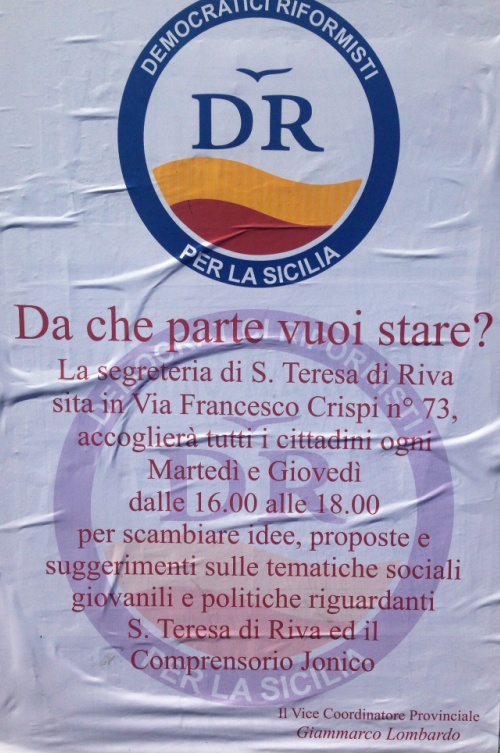 SANTA TERESA DI RIVA – Apre domani a Santa Teresa di Riva la sede dei Dr (Democratici Riformisti per la Sicilia) “per accogliere tutti i cittadini e scambiare idee, proposte e suggerimenti sulle tematiche sociali, giovanili e politiche riguardanti Santa Teresa di Riva ed il comprensorio jonico” come recita il manfesto-invito fatto affiggere in questi giorni. I Dr nel comprensorio crescono grazie al grande impulso che sta dando lo staff del vice coordinatore provinciale, delegato per la zona jonica, Giammarco Lombardo. Le adesioni non mancano, è stato già costituito un gruppo abbastanza nutrito che ha subito recepito la proposta di Lombardo per voltare pagina anche nella gestione della cosa pubblica cittadina, ed ora si cominciano ad affrontare i temi che interessano più da vicino la gente, ed è per questo che è stata aperta una sede dove i referenti provinciali e regionali del partito incontreranno i cittadini. La sede è in via Francesco Crispi 73 nella zona di Barracca e l’iaugurazione è stata annunciata alla cittadinanza con un grande manifesto comparso sui muri cittadini. E’ aperta il martedì ed il giovendì alle 16 alle 18.