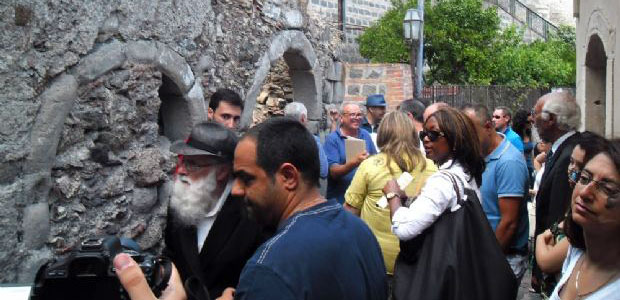 SAVOCA – “Si, è una sinagoga”, conferma ufficiale più autorevole non poteva venire che da una commissione di esperti in arte e storia giudaica – organizzata dall’Archeoclub area jonica del presidente Mimmo Costa – saliti ieri fino a Savoca per visitare i ruderi di quella che sin dal 1997, grazie ad una intuizione del direttore del locale museo, Santo Lombardo, era stata indicato come luogo di culto dei giudei della Valle d’Agrò. L’autorevolezza della conferma è venuta dal rabbino Yitzhak Ben Avraham, 69 anni, fondatore della sinagoga di Siracusa, giunto a Savoca con una nutrita delegazione di studiosi autorevoli quali il prof. Ignazio Vecchio, docente presso l’Università di Catania e segretario della “Federazione delle Comunità Ebraiche del Mediterraneo”, del dott. Gabriele Spagna, segretario della Comunità Ebraica di Siracusa, della prof.ssa Cristina Tornali, presidente dell’AIN Onlus – Associazione Italiana Neurodisabiliche ospita gli uffici di Rappresentanza Ebraica “U.R.E. Shalom”di Catania e di Giardini Naxos, del prof. Umberto Garro, direttore del giornale on line “Kolot News”,del avv. Silvio Aliffi, presidente dell’Associazione di Amicizia Sicilia-Malta e dall’arch. Piero Arrigo, storico ricercatore della Storia e Cultura Ebraica Siciliana, che venti anni fa (1997) effettuò il primo sopralluogo nella sinagoga di Savoca, appena scoperta. L’interesse della comunità giudaica siciliana si è rinnovato in seguito alla scoperta all’interno della sinagoga di un frammento di pietra con incisa la stella di Davide, che era stata murata all’interno di un muro divisorio costruito quando la sinagoga venne abbandonata per l’editto del re spagnolo che bandì gli ebrei dal suo regno. Il muro è parzialmente crollato qualche mese fa e la “Stella di Davide” è ritornata alla luce. Il rabbino ha preso visione della pietra ed in un primo momento l’ha bollata come un falso. Colpa di chi l’aveva raschiata per pulirla. Poi in un angolo si è scoperta l’autenticità del reperto. La visita all’edificio che sulla circonvallazione accanto alla chiesa di S.Michele doveva essere una sinagoga ha fugato gli ultimi dubbi. Sul frontespizio (pericolosamente inclinato), all’interno del rudere ormai diroccato, sono stati rinvenuti segnali che per il rabbino ed il suo pool di esperti hanno un significato importante. E così aduno dei suoi collaboratori ha fatto estrarre da una custodia lo shofar, un corno di montone, che gli ebrei suonano durante alcune cerimonie religiose, e soffiandovi con quel (poco) fiato che aveva, ha fatto risuonare la sua “voce”, poi ha recitato una preghiera nella lingua dei padri. Era la conferma che per loro, gli ebrei, quello che stavano calpestando, era un luogo sacro.