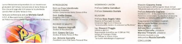 Alle 17 presso l’antica filanda di Roccalumera comincerà il seminario sul tema “Autismo…per andare…oltre lo sguardo” che ha lo scopo di offrire una occasione di approfondimento in merito ad un argomento molto delicato che coinvolge, con le sue complesse problematiche, bambini, ragazzi, genitori, scuole. I lavori saranno moderati dalle professoresse Cettina Carnabuci e Mimma Sturiale. Dopo l’introduzione della prof.sa Enza Interdonato, dirigente dell’Istituto Comprensivo di Santa Teresa di Riva, e il saluto dell’avv. Antonio Scarcella, presidente del Lions di Santa Teresa, e dei sindaci Gaetano Argiroffi (Roccalumera) e Cateno De Luca (S.Teresa), sono previsti importanti contributi su argomenti specifici, a cura della prof.ssa Rosa Angela Fabio, docente di Psicologia Generale presso l’Università degli studi di Messina, dell’ing. Giovanni Pioggia, direttore del Phc e responsabile scientifico per il Cnr del Phc dell’Istituto di Fisiologia Clinica del Cnr per la ricerca clinica, del maestro Giacomo Arena, musicoterapeuta presso l’AvantGarde Music School e della prof.ssa Antonella Gagliano, direttore Uoc Neuropsichiatria infantile presso Policlinico Universitario “Gaetano Martino” di Messina.
