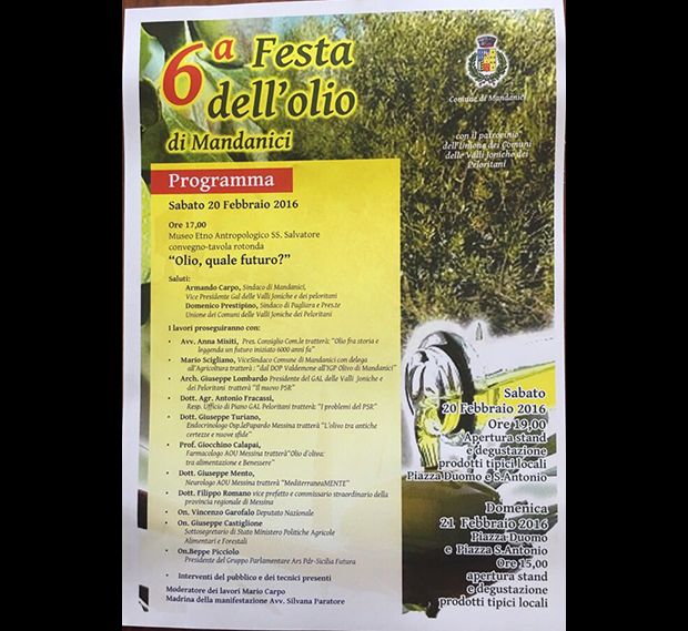 Mandanici – Sabato e domenica venti e ventuno febbraio a Mandanici ci sarà l’attesissima sesta edizione della “Festa dell’Olio”. Una manifestazione molto importante che sicuramente riunirà nel comune ionico tantissime persone. Si comincerà sabato alle 17 con il convegno “Museo Etno Antropologico SS.Salvatore”. Interverrà il sindaco Armando Carpo, il presidente dell’Unione dei Comuni delle Valli Joniche dei Peloritani, Domenico Prestipino e tanti altri personaggi illustri. Moderatore sarà Mario Carpo. Dalle 19 apertura stand e degustazione prodotti tipici locali in piazza Duomo e piazza S.Antonio. Stessa cosa domenica a partire dalle ore 15. Due giorni di assoluto interesse per tutti i residenti dei comuni del nostro comprensorio ma anche per turisti e vacanzieri.