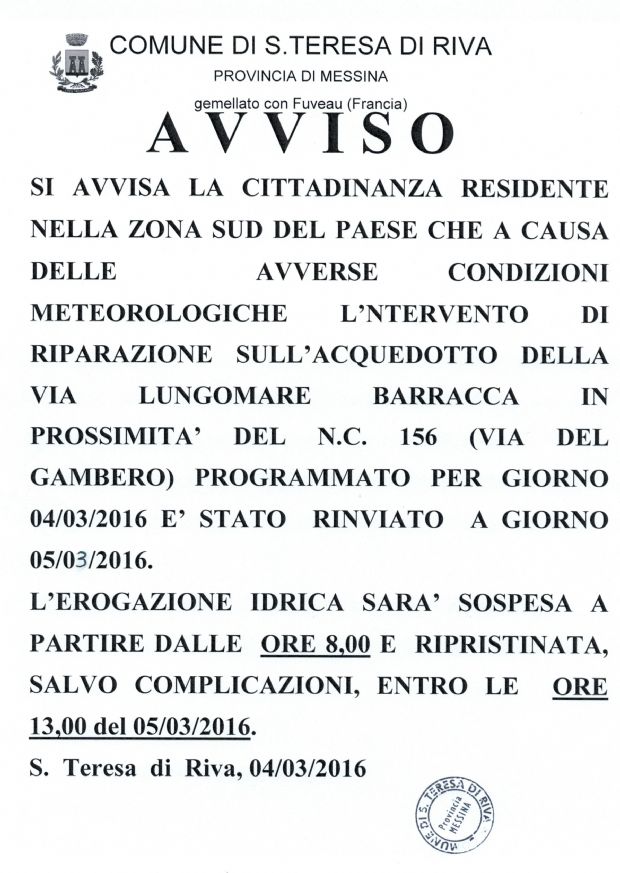 S.Teresa di Riva – E’ stata rimandato a domani l’intervento sul lungomare, e quindi l’interruzione dell’erogazione dell’acqua è stata spostata di ventiquattro ore. Allegato il comunicato del Comune.