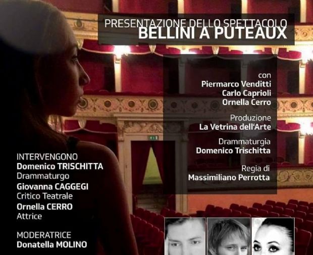 SANTA TERESA DI RIVA – Domani mattina (sabato 29) alle 11 a Villa Ragno verrà presentato lo spettacolo “Bellini a Puteaux” che debutterà al Piccolo Teatro di Catania sabato 13 maggio. L’opportunità per la presentazione a Villa Ragno è data dall’attrice Ornella Cerro che è originaria di Santa Teresa di Riva e che reciterà in questo spettacolo prodotto da “La vetrina dell’Arte” e sarà anche interpretato da Pirmarco Venditti, e Carlo Caprioli per la regia di Massinmiliano Perrotta. Il dramma, scritto da  Domenico Trischitta, racconta gli ultimi mesi del musicista catanese Vincenzo Bellini in Francia dove morì prematuramente prima dei 34 anni. All’incontro a Villa Ragno, moderato da Donatella Molino,  parteciperanno Domenico Trischitta e Ornella Cerro con il critico teatrale Giovanna Caggegi. (gi.pu.)