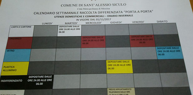 S.Alessio Siculo – C’è protesta. Parecchie famiglie contestano il nuovo calendario invernale relativo alla raccolta differenziata, che partirà il primo novembre dopo precisi accordi con l’Ato Me4. Contestano il servizio raccolta indifferenziata che sarà espletato soltanto lunedi e sabato. “E come si fa a tenere in casa per cinque giorni questi rifiuti?” Così si è espressa una mamma. In verità la puzza e le mosche aggredirebbero tutta la casa, per cui sarebbe opportuno un interventi immediato del sindaco con i dirigenti dell’Ato Me4 e con gli operai per una terza raccolta indifferenziata durante la settimana.
