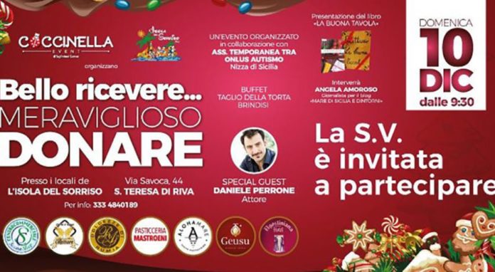 S.Teresa di Riva – Domenica 10 dicembre , con inizio alle ore 9,30, si svolgerà nei locali dell’Isola del Sorriso in via Savoca, accanto Scevacar, una significativa manifestazione dal titolo “Bello vincere meraviglioso donare”. Organizzato in collaborazione con l’Associazione Temporanea tra Onlus Autismo di Nizza di Sicilia, l’evento sarà arricchito di personaggi della cultura e dello spettacolo, tra cui il noto attore santateresino (vive a Roma) Daniele Perrone. Nel corso della manifestazione, che si svolgerà in collaborazione con Coccinella di Carmen Saglimbeni, sarà presentato il libro “La Buona Tavola”. E alla fine dello spettacolo un ricco buffet, con taglio della torta e brindisi.
