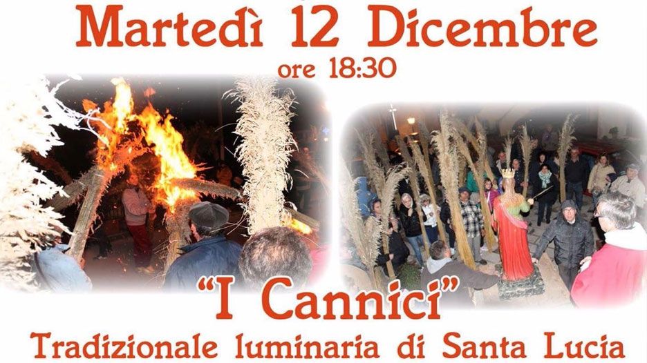Il programma prevede alle ore 17:30 Santa messa e alle ore 18:30 tradizionale luminaria di Santa Lucia, che consiste nel giro del paese da parte dei cittadini con in spalla un fascio di canne secche dette “cannici” infuocate al lato estremo. Al termine del giro, le “cannici” vengono posizionate in piazza a formare un falò. Queste canne accese illuminano l’oscurità della notte e riportano ai festeggiamenti pagani del solstizio d’inverno, che prima della riforma del calendario da parte di Papa Gregorio XIII cadeva proprio in questo giorno. Il loro significato tramite il fuoco e l’oscurità si rifà alla Santa protettrice della vista e simboleggia il potere nella fede in Dio che va oltre le tenebre.