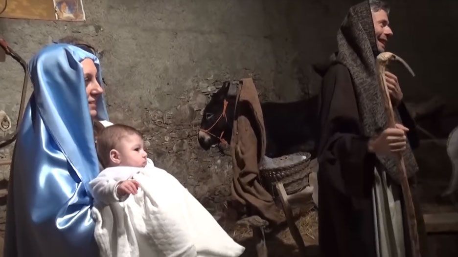 La scena madre della “Sacra Famiglia” è impersonata da una vera e propria famiglia del luogo: i Ferraro. Il papà Onofrio con la moglie Maria Di Bella, e il figlio Giuseppe (Gesù Bambino).