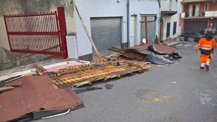 A causa delle forti raffiche di vento, che in questo momento stanno flagellando tutta la Sicilia Orientale, una tettoia in laminare, di circa 30 mq e di notevole peso, si è divelta da una palazzina della via Graziella Campagna (Moira Masserenti) ed è andata a collidere con il terrazzo dell’abitazione di fronte attraversandolo e finendo la sua corsa sulla carreggiata. Di notevole entità i danni registrati. La tettoia infatti, una volta staccatasi, dal quato piano, lungo il suo percorso, ha danneggiato una struttura posta su un terrazzino, un balcone, ed una Citroen C3 parcheggiata. Il conducente di una Fiat Stilo Station Wagon, A. I., del luogo, che stava percorrendo la piccola arteria ha frenato in tempo.