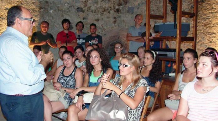 (Nella foto l’avv. Carlo Mastroeni mentre spiega alle belle ragazze straniere  i trascorsi a Roccalumera del Nobel)