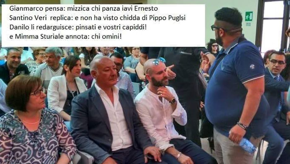 “Gianmarco pensa: mizzica chi panza iavi Ernesto. Santi Veri replica: non hai vistu chidda di Pippo Puglisi. Danilo li redarguisce: pinzati e vostri capiddi. E Mimma Sturiale annota: chi omini”.