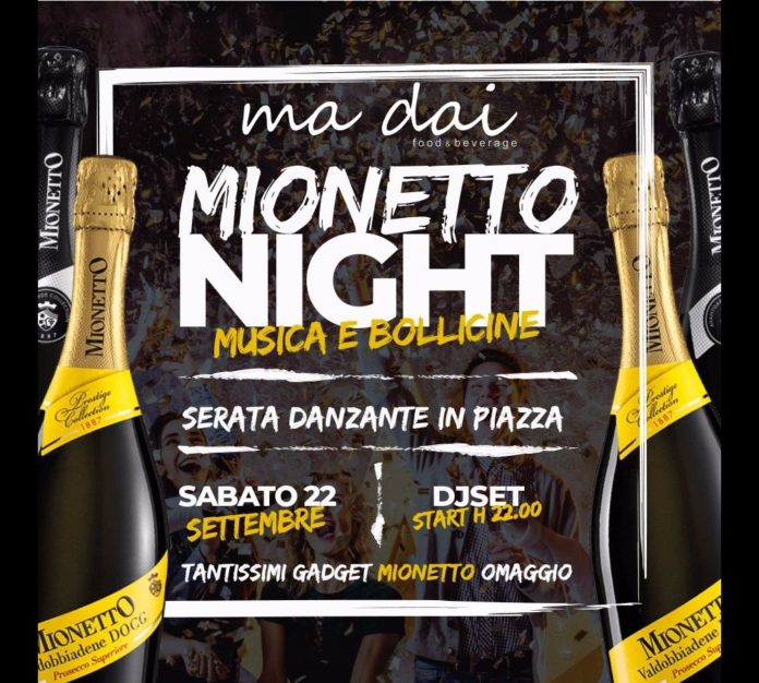 Sabato 22 Settembre, nella bellissima cornice della Piazza Pietro Cuppari di Itala, si terrà una serata all’insegna della musica e delle bollicine. Protagonista una delle etichette più in voga del momento, il Mionetto. L’Organizzazione del tutto è a firma del “Ma dai Food & Beverage”, rinomato locale italese, conosciuto sia per la qualità dei prodotti (che variano dal bar, aperitivi, pizzeria etc.) che per la professionalità e competenza del personale. Insomma, una festa da non perdere.