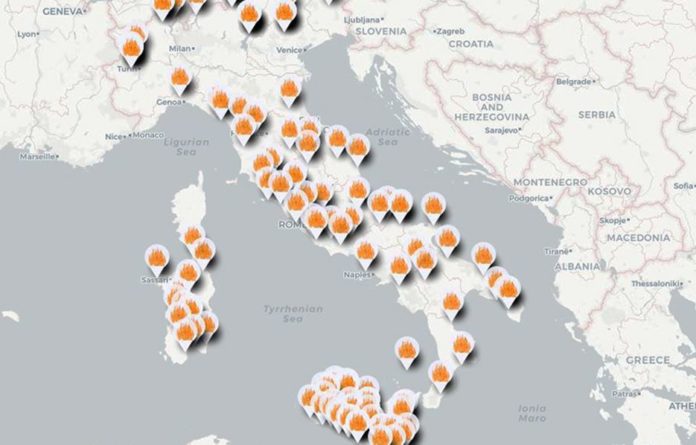 In sede di quella commissione, sia i dirigenti dell’Azienda che quelli dell’ Ispettorato (compresa la dott. Di Trapani ), ebbero a sostenere che il fuoco va sconfitto coi lavori preventivi da terra e che i mezzi aerei rappresentano un ausilio importante per tale fine. Tutti i presenti, non fecero mistero che le favorevoli condizioni meteo dell’anno in corso stavano favorendo l’abbattimento del fenomeno degli incendi. Per queste ragioni il Sifus non solo contesta i meriti che si è accaparrato il Governo Musumeci sulla materia in argomento, ma sopratutto, le dichiarazioni del Comandante del Corpo forestale Regionale, Dott. Principato che ha avuto il giurassico coraggio di sostenere che il merito della riduzione degli incendi sia dipeso sopratutto, dall’ uso di maggiori velivoli aerei. In ogni caso sappia il Governo Musumeci che, nonostante la riduzione delle superfici incendiate del 73%, la Sicilia anche quest’ anno è tra le regioni più bruciate d’Italia, come si evince dai dati forniti dal centro europeo Copernicus Ems e dalla mappa di “Italia a Fuoco”, realizzata in collaborazione con OpenData Sicilia» conclude Grosso. (nella foto la mappa degli incendi in Italia)