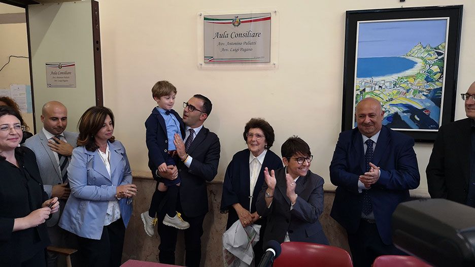 Grande partecipazione di cittadini e amministratori locali per l’intitolazione della sala consiliare all’ex sindaco Nino Puliatti e al consigliere comunale Luigi Pagano che hanno avuto grande rispetto del ruolo di gestori della cosa pubblica svolgendo anche la professione di avvocati.
