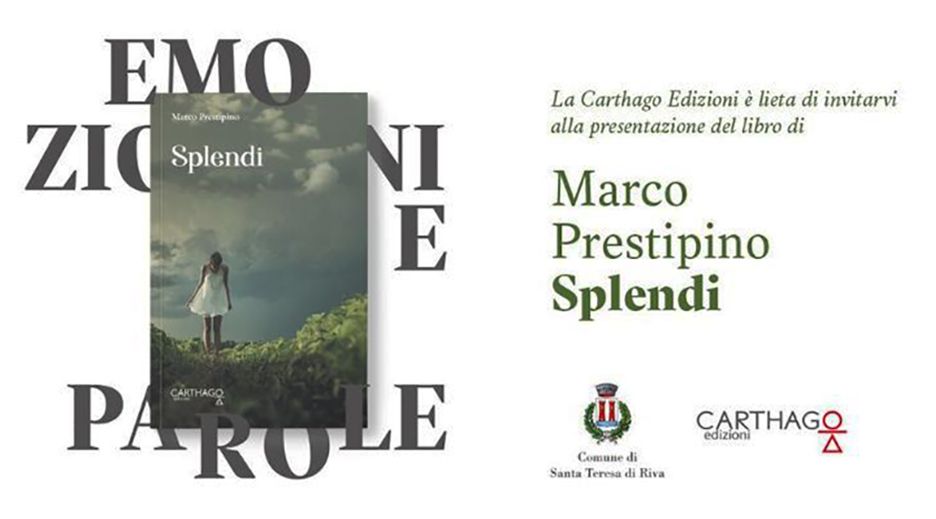 S.Teresa di Riva – Sabato (15 giugno) alle ore 17,30 nel vasto salone di Villa Ragno, a S.Teresa, si svolgerà la cerimonia di presentazione del libro “Splendi” di Marco Prestipino, edito dalla Carthago Edizioni.