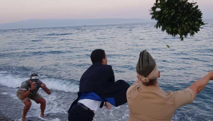 Furci Siculo – Nella splendida location del Lido Bella Vita di Furci Siculo si è svolto un interessante convegno per commemorare lo sbarco degli alleati in Sicilia nel 1943. Ed è stato un evento eccezionale, perché hanno preso parte oltre il sindaco Matteo Francilia e l’amministrazione comunale, il prof. Ignazio Vecchio, Alberto Lunetta ( ufficio stampa dei marines di base a Sigonella) e numerosi Consoli onorari di diversi paesi europei. Una corona di alloro , benedetta da padre Massimo Briguglio, è stata poi lanciata in mare (dal sindaco e da un marines) a ricordo dei caduti della seconda guerra mondiale e della conquistata libertà e democrazia. In quel momento è stao osservato un minuto di raccoglimento, mentre veniva suonato il Silenzio, nella commozione generale. .(Il sindaco e un marines mentre buttano la corona d’alloro in mare)