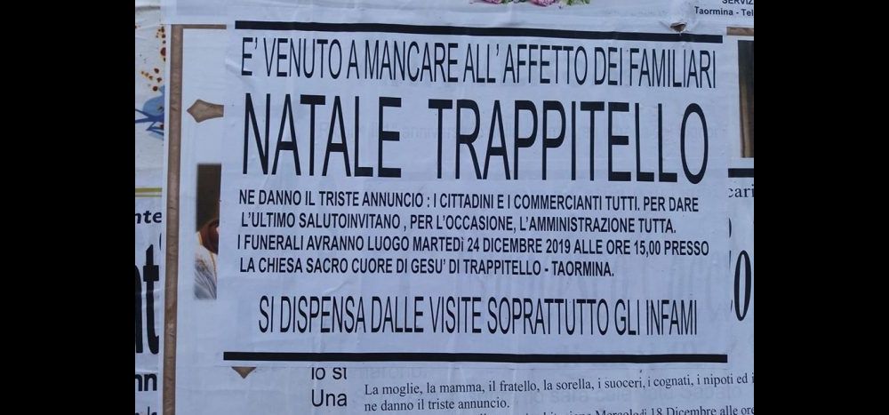 Taormina- Nella popolosa frazione di Trappitello, avant’ieri, sono apparsi diversi manifesti che per alcuni sono stati giudicati pesanti e fuori luogo. In sostanza una sorta di annuncio funebre diretto all’amministrazione comunale guidata dal sindaco Mario Bolognari rea, secondo il responsabile del manifesto, di non aver organizzato alcuna manifestazione natalizia a Trappitello. Non si è fatta attendere la risposta dell’esecutivo taorminese, difatti il vicesindaco Enzo Scibilia ha presentato una denuncia contro ignoti presso il Commissariato di Polizia di Stato di Taormina.
