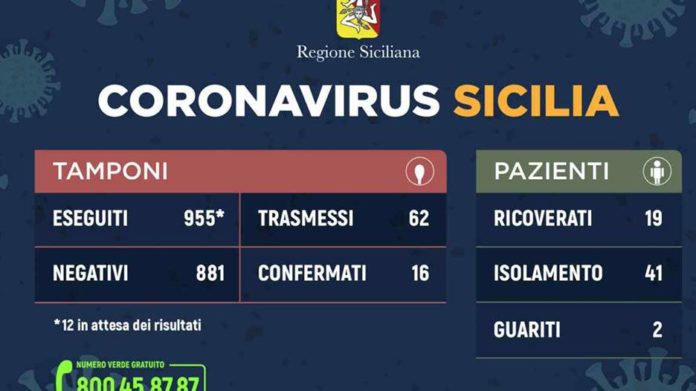 Risultano ricoverati 19 pazienti (sette a Palermo, cinque a Catania, due a Messina, uno a Caltanissetta, tre ad Agrigento e uno a Enna) di cui uno in terapia intensiva per precauzione, mentre 41 sono in isolamento domiciliare e 2 sono guariti.
