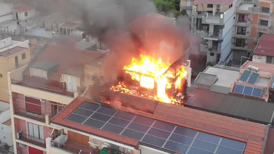 Spaventoso incendio a Roccalumera. Intorno alle ore 16.00, per cause ancora da accertare, alte lingue di fuoco sono comparse su un attico, in legno, di un palazzo a tre piani. Le fiamme hanno immediatamente divorato tutto ed una grossa nuvola di fumo nera si è innalzata in cielo, visibile da tanti paesi della riviera. L’abitazione è posizionata a duecento metri dal casello autostradale, sulla Via Umberto I, proprio alle spalle del rifornimento di benzina. Carabinieri, con il comandante Roberto Montagna, sono sul posto insieme ai vigili urbani costretti a deviare il traffico sul lungomare. Fortunatamente la proprietaria era fuori. Sono giunti tempestivamente anche i vigili del fuoco del distaccamento di Letojanni con il supporto di una squadra del comando provinciale di Messina con un’autoscala. Gli uomini dell’anticendio pompieri sono intervenuti sia dall’alto che dall’interno per arginare e spegnere le alte lingue di fuoco che hanno distrutto alcuni pannelli fotovoltaici installati a ridosso della tettoia. Non si conoscono al momento le cause che hanno generato il vasto incendio, probabilmente è stato un corto circuito.