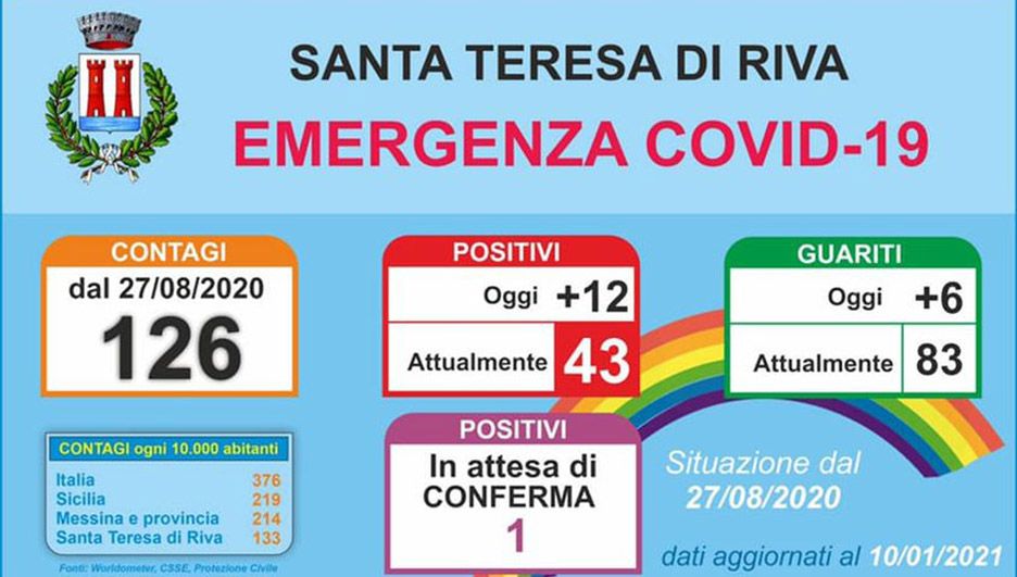 S.Teresa di Riva – Erano tre inizialmente i contagiati di coronavirus, poi sono passati a 9, a 16, a 24 ed ora a 43. La curva va sempre a salire. Nel comunicato diramato dal sindaco si legge: “Il numero delle persone attualmente positive è di 43 (di cui 12 nuovi comunicatici oggi). Le persone guarite non più positive sono 83 (di cui 6 guariti oggi). Solo una persona ci ha comunicato informalmente di essere risultata positiva e siamo in attesa di ricevere ulteriori comunicazione da parte di Asp”. Ma sui social la gente si scatena, ha paura ed invoca l’intervento delle autorità per scongiurare un incremento dei contagi.