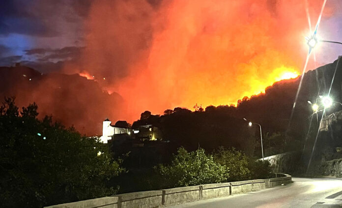 Roccalumera – Un incendio mai visto sta causando rovine su rovine. Le fiamme si sono sviluppate nel primo pomeriggio, poi alimentate dallo scirocco hanno coperto tutta la collina che dalla frazione Sciglio porta nel borgo di Contrisa, che è circondato dalle fiamme. Tre famiglie hanno dovuto abbandonare le loro case e mettersi in salvo. Squadre della Forestale di Savoca, volontari, vigili del fuoco, carabinieri, vigili urbani, tutti sul posto a lavorare per circoscrivere le alte lingue di fuoco. Le fiamme si sono allargate a macchia d’olio in tutta la contrada, prima con fumo nero e poi con fuochi sparsi che non hanno risparmiato vigneti, uliveti e alberi da frutto, finiti tutti in cenere. Danni ingenti. Non c’erano ne Canadair, nè elicotteri della Protezione civile, i cittadini da soli hanno lottato contro le fiamme. Il fuoco si è spostato poi sulla frazione Allume, dove altre famiglie lascerebbero le proprie case per dormire dai parenti. Il sindaco e amministratori comunali sono sul posto, insieme al comandante dei carabinieri, gli uomini della Forestale e vigili del fuoco. La situazione è critica. Si spera che cali il vento, così l’avanzata del fronte del fuoco possa subire una frenata. Notte di fuoco.