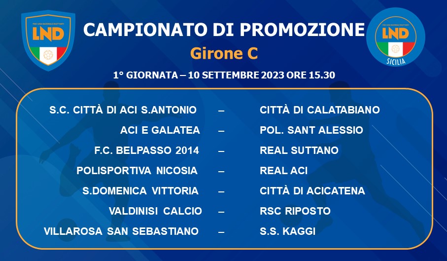 In Promozione subito match clou per la Valdinisi di mister Roberto Frazzica che ospiterà il temibile Riposto. Una squadra giovane quella valdinisana che punterà a migliorare la classifica dello scorso anno. Idem per il rinnovato S.Alessio di mister Giacomo Parisi che esordirà in trasferta contro l’Aci e Galatea. Prima gara esterna anche per la matricola Kaggi di mister Alessio Camarda che andrà a fare visita al Villarosa San Sebastiano. Di seguito la prima giornata dei due tornei: